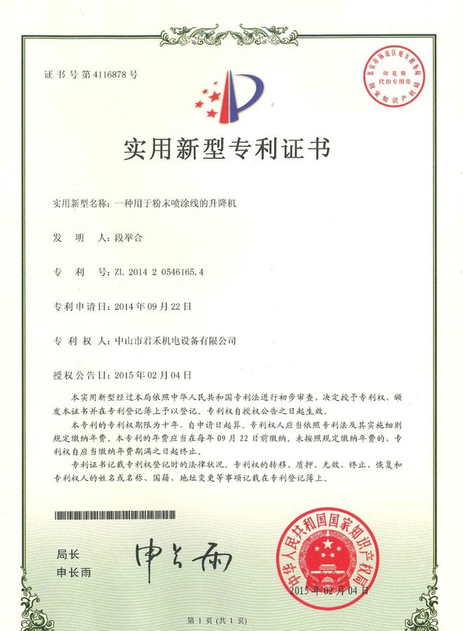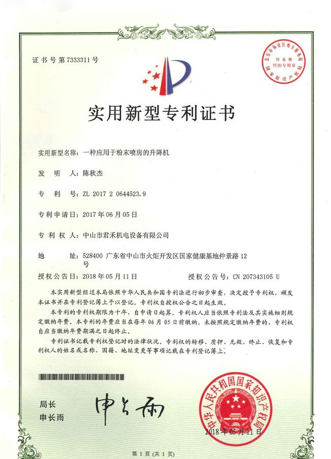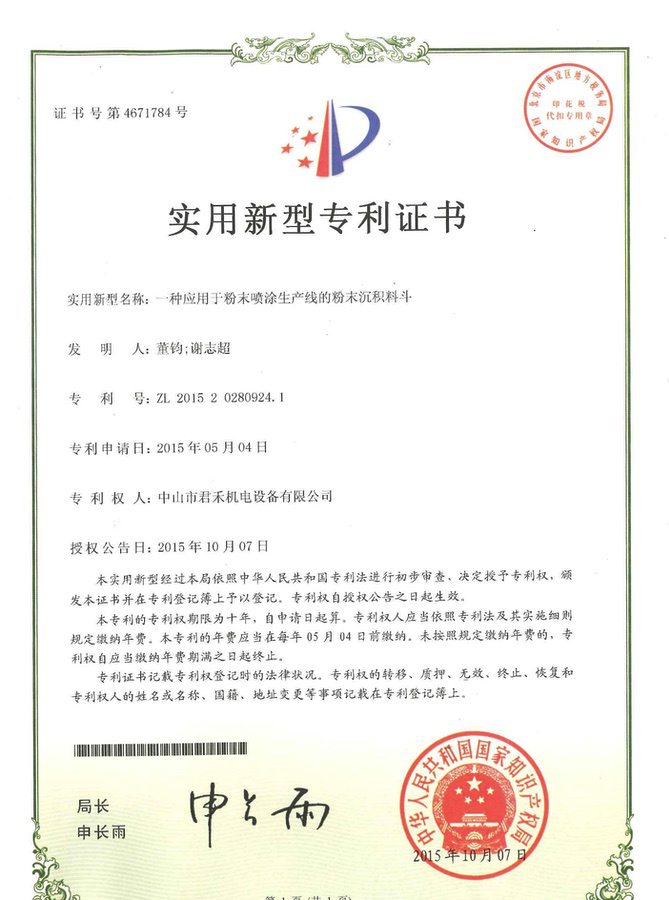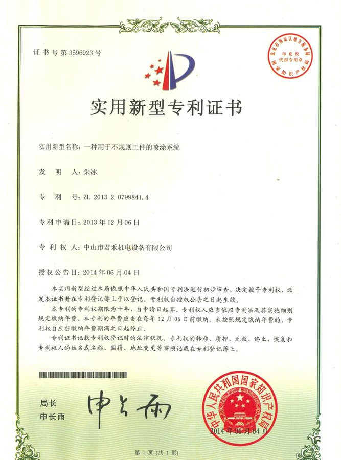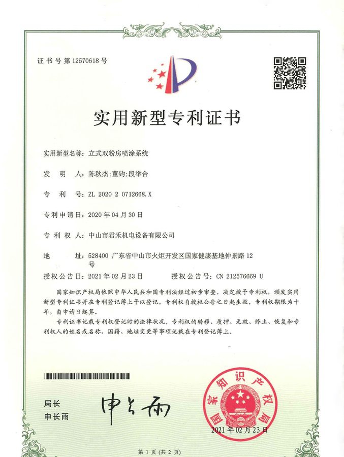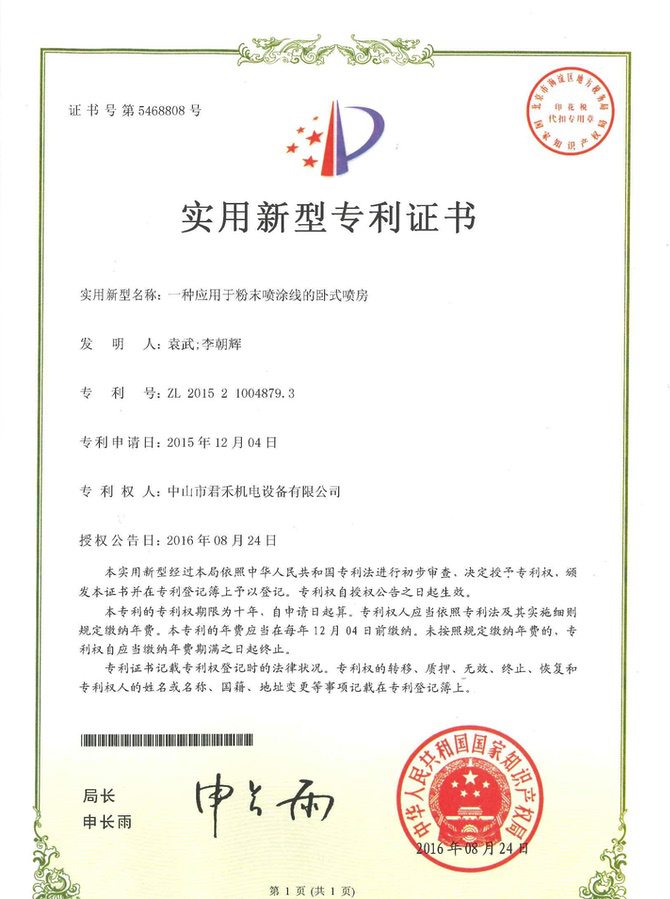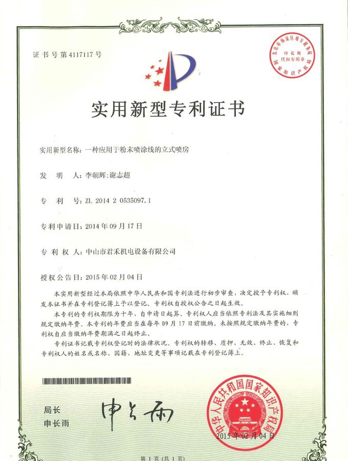 喷房(中字型快速换色立式) 外观设计专利证书